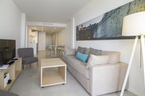 This 50 m2 one-bedroom apartment comes with 2 single beds or 1 large double (on demand) and 1 sofa bed.Â